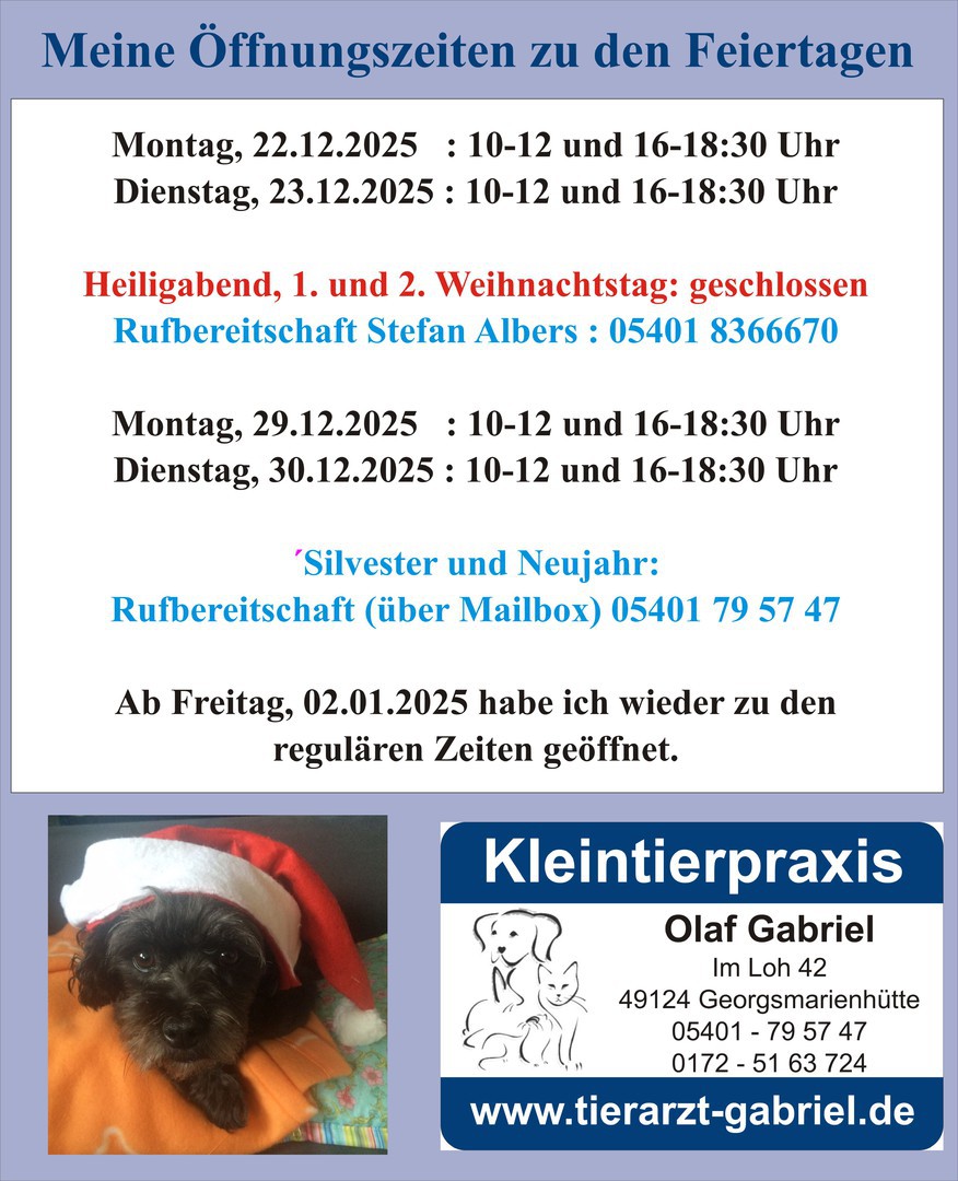 Wenn Sie sich aufgrund eines tierärztlichen Notfalls außerhalb der Sprechstunden telefonisch melden, hinterlassen Sie bitte in jedem Fall eine Nachricht auf der Mailbox.